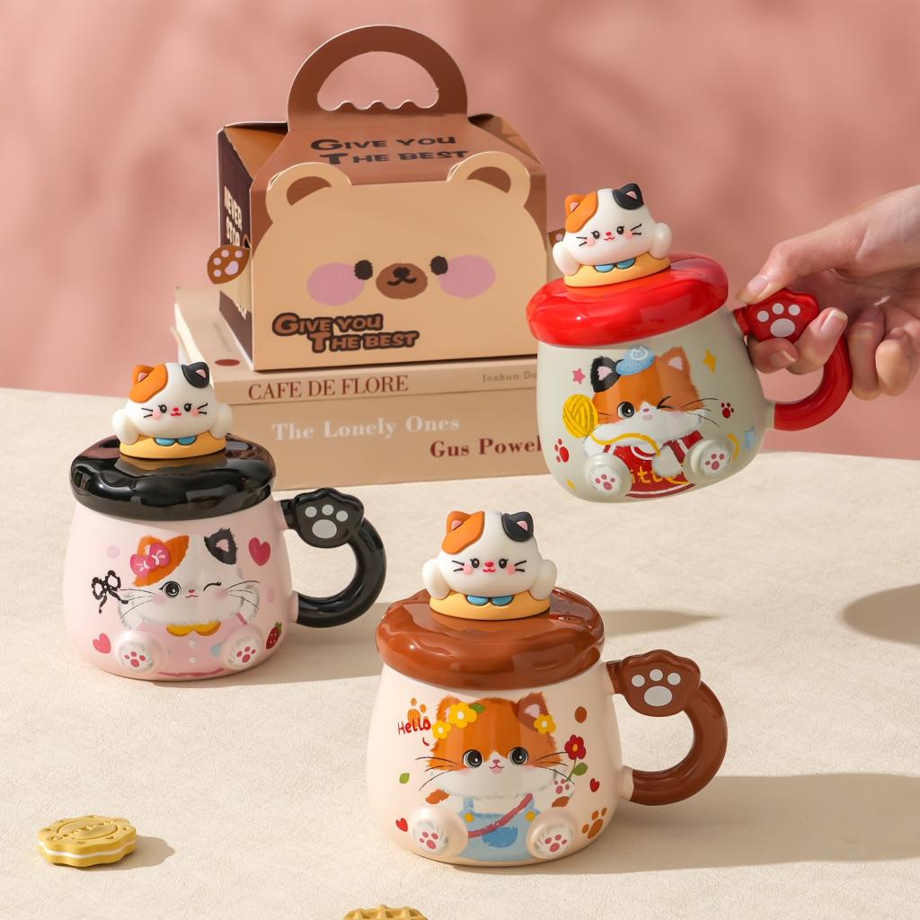 Cartoon Piggy and Puppy Ceramic Mug with Lid and Spoon
